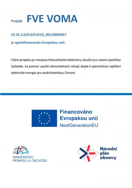 I v naší společnosti VOMA myslíme na ekologii a řešení problémů s energetickou situací. Proto se nám v letošním roce podařilo realizovat výstavbu fotovoltaické elektrárny o výkonu téměř 50kWp. K její výstavbě jsme využili podporu Národního plánu obnovy. VOMA, s.r.o.