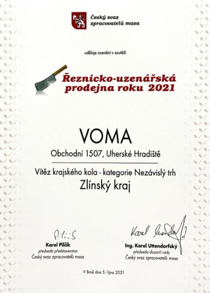 S hrdostí oznamujeme, že naše prodejna masa a uzenin VOMA, s.r.o. v Uherském Hradišti v Rezidenci Hradební (Obchodní ulice) obdržela ocenění jako Nejlepší řeznicko uzenářská prodejna za rok 2021 ve Zlínském kraji.